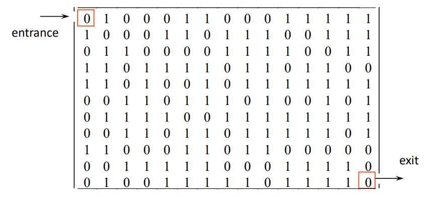 미로 탈출하기 문제 : 입구로부터 출구로 나가는 길을 찾아라! 조건 : 0은 움직일 수 있는 길, 1은 불가능한 길이다. 방향 : 상하좌우, 대각선으로 움직일 수 있다. 추가적인 안내 미로는 2차원 배열에 구현되어 있다. 입구는 maze[0][0]이고, 출구는 maze[row-1][col-1]이다. 나가는 길을 찾기 위해 move[0] move[1] move[2] move[3] 을 사용할 수 있다. maze[next_row][next_col] = ? mark라는 배열을 만들어 지나온 길을 기록해둔다. mark = [[0]*10 for i in range(10)] mark=[[0]*10 for i in range(10)] print(mark) path stack backtracking을 위한 stack으로..